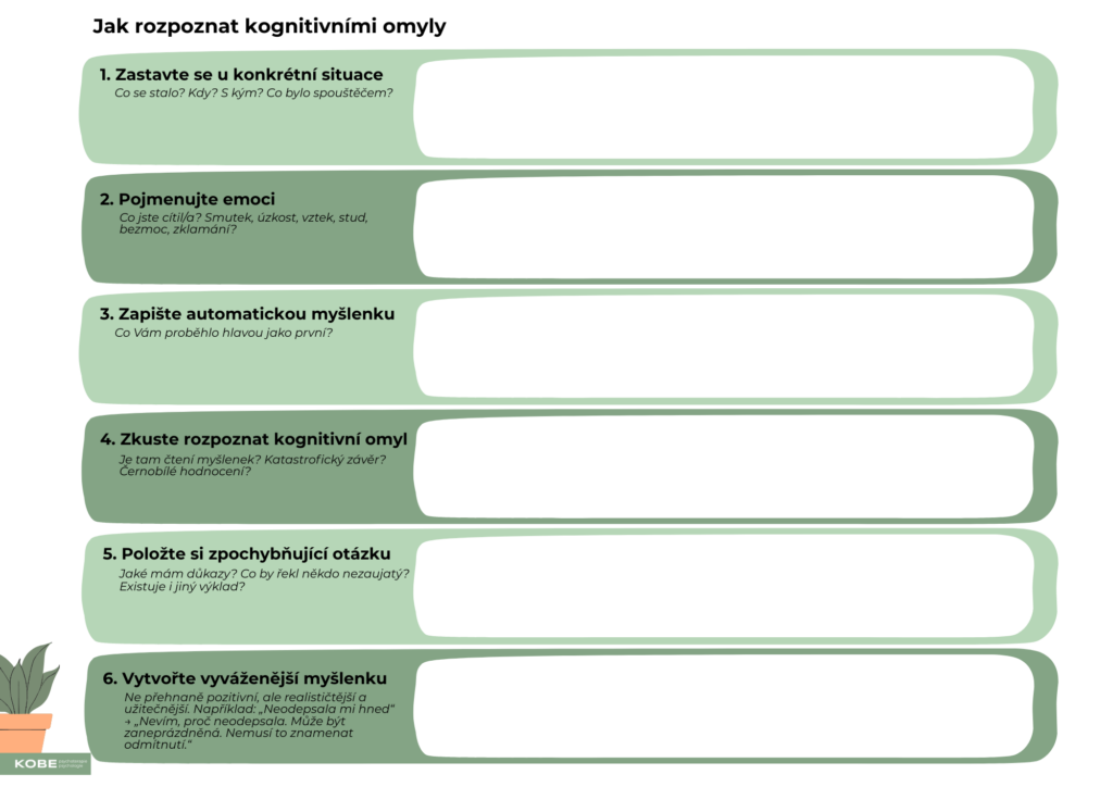 Právě v takových chvílích může být užitečný jednoduchý formulář na rozpoznání kognitivních omylů. Pomáhá zpomalit automatickou reakci, podívat se na situaci s větším odstupem a najít realističtější pohled.