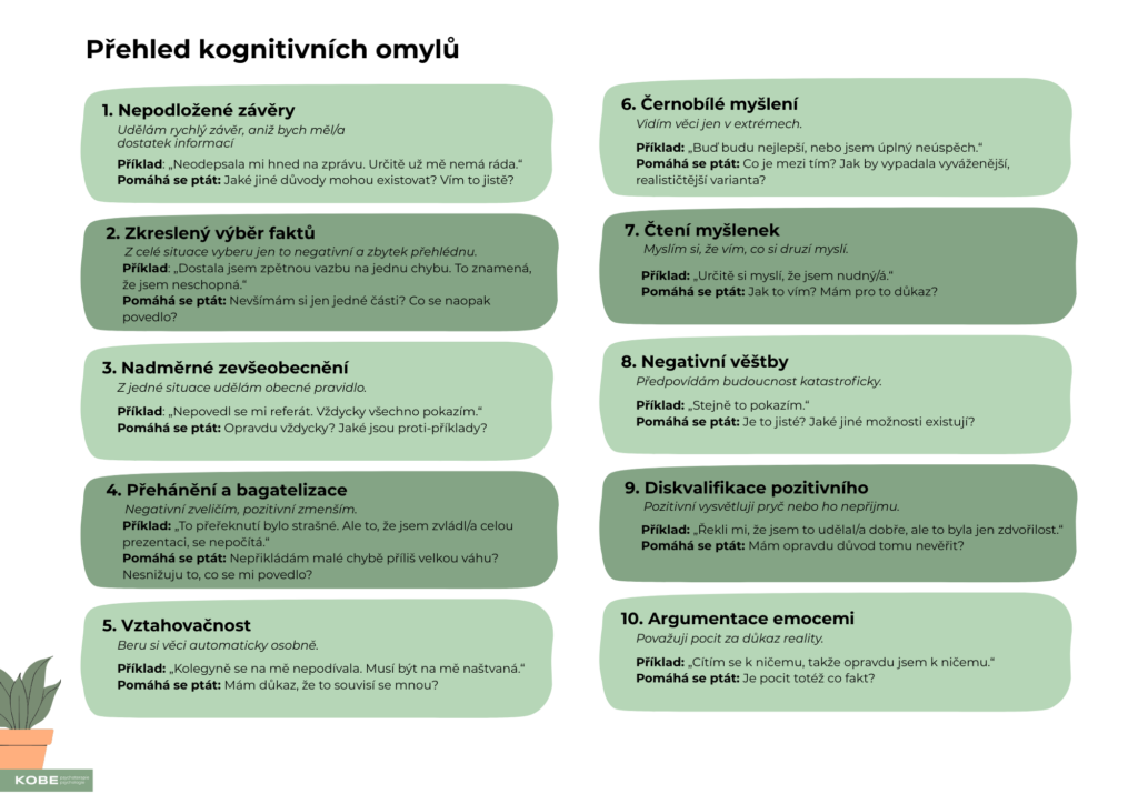 Kognitivní omyly jsou zkreslené způsoby myšlení, které se objevují automaticky. Často působí velmi přesvědčivě, ale nemusí odpovídat realitě. Můžeme například rychle dojít k závěru bez dostatku informací, vybrat si ze situace jen to negativní, předvídat katastrofický vývoj nebo brát věci automaticky osobně. Ve formuláři i v přehledu jsou uvedeny časté typy těchto omylů, například nepodložené závěry, zkreslený výběr faktů, nadměrné zevšeobecnění, přehánění a bagatelizace, vztahovačnost, černobílé myšlení, čtení myšlenek, negativní věštby, diskvalifikace pozitivního a argumentace emocemi.