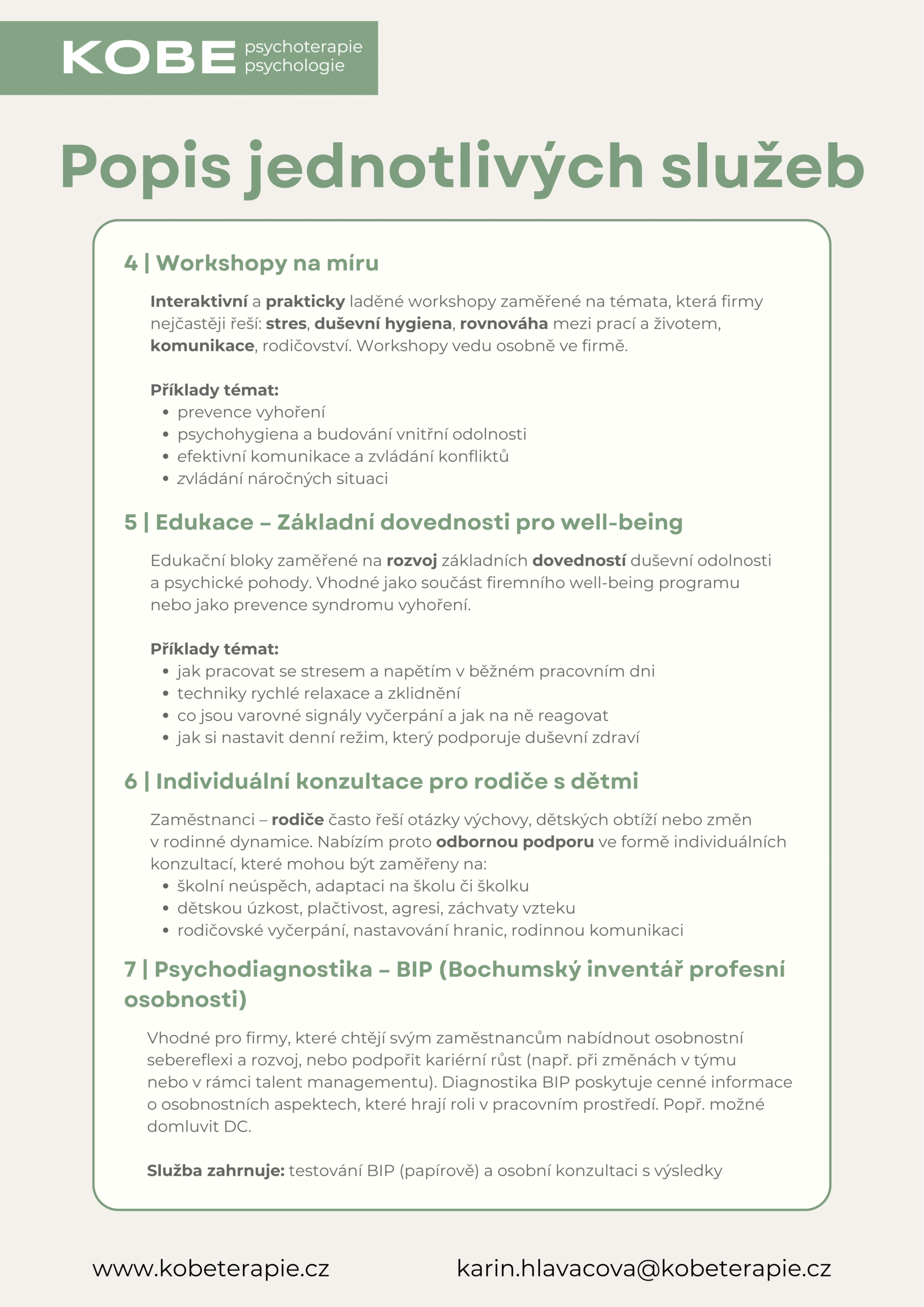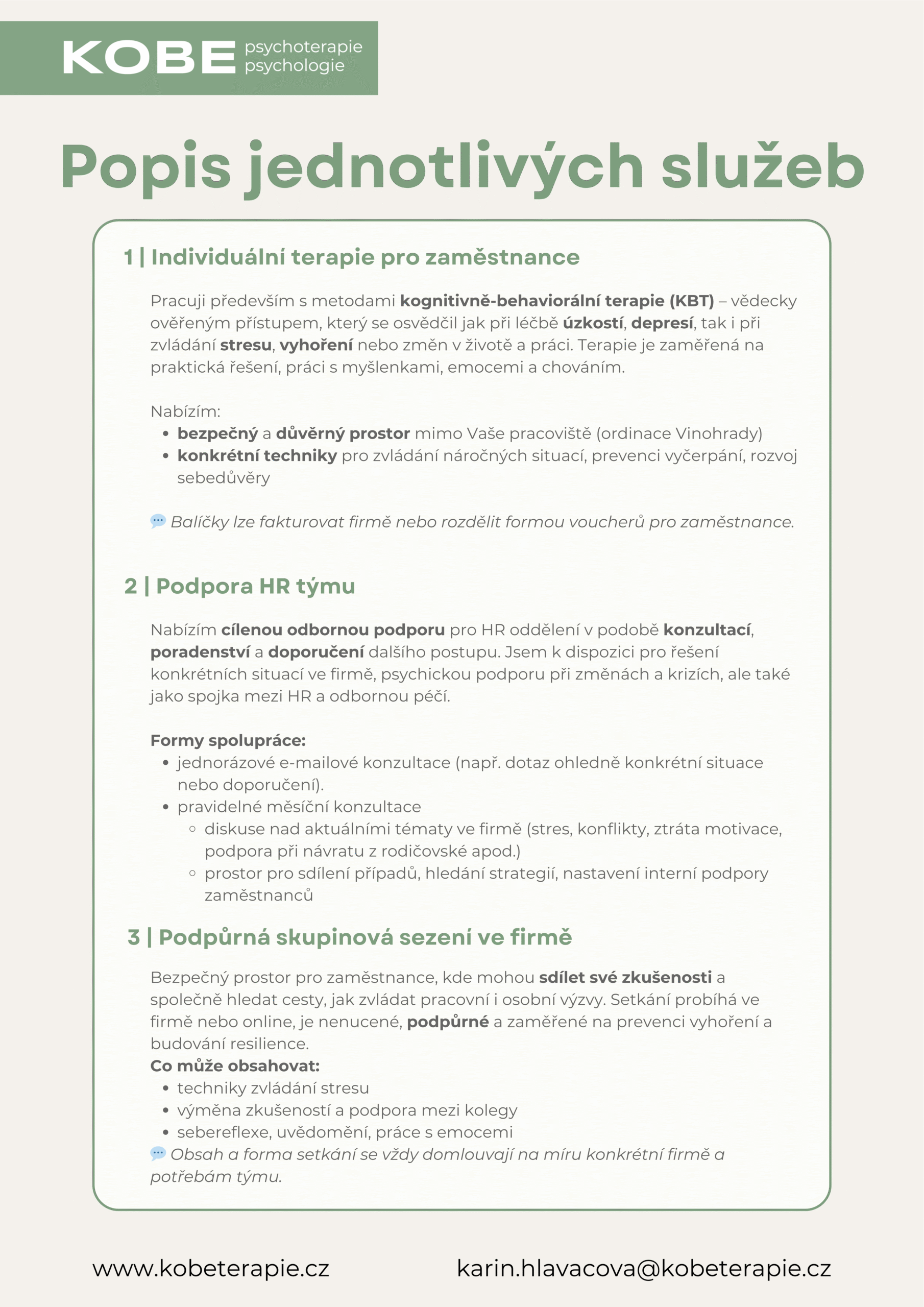Firemní nabídku stavím na propojení dvou světů – praxe v oblasti psychologie práce a organizace a zkušeností z individuální psychoterapeutické práce. V minulosti jsem se aktivně věnovala rozvoji zaměstnanců, podílela se na tvorbě a vedení development center a spolupracovala s firmami na podpoře týmové spolupráce i leadershipu.