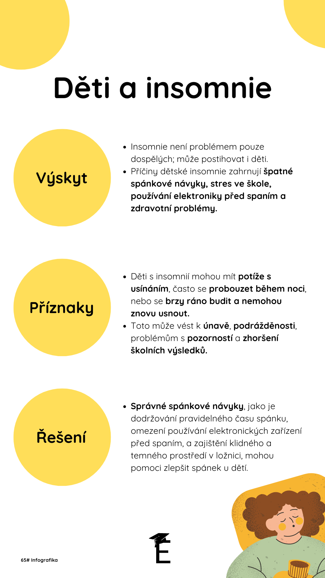 Malé děti potřebují 10 až 11 hodin spánku, zatímco dospívající potřebují 8 až 10 hodin (dospělí potřebují 7 až 8 hodin). Problémy se spánkem u dětí často vznikají, pokud nejsou dodržovány pravidelné časy, kdy se jde do postele. Komorbidní duševní poruchy jako ADHD, deprese nebo úzkost mohou také přispět k problémům se spánkem u dětí.