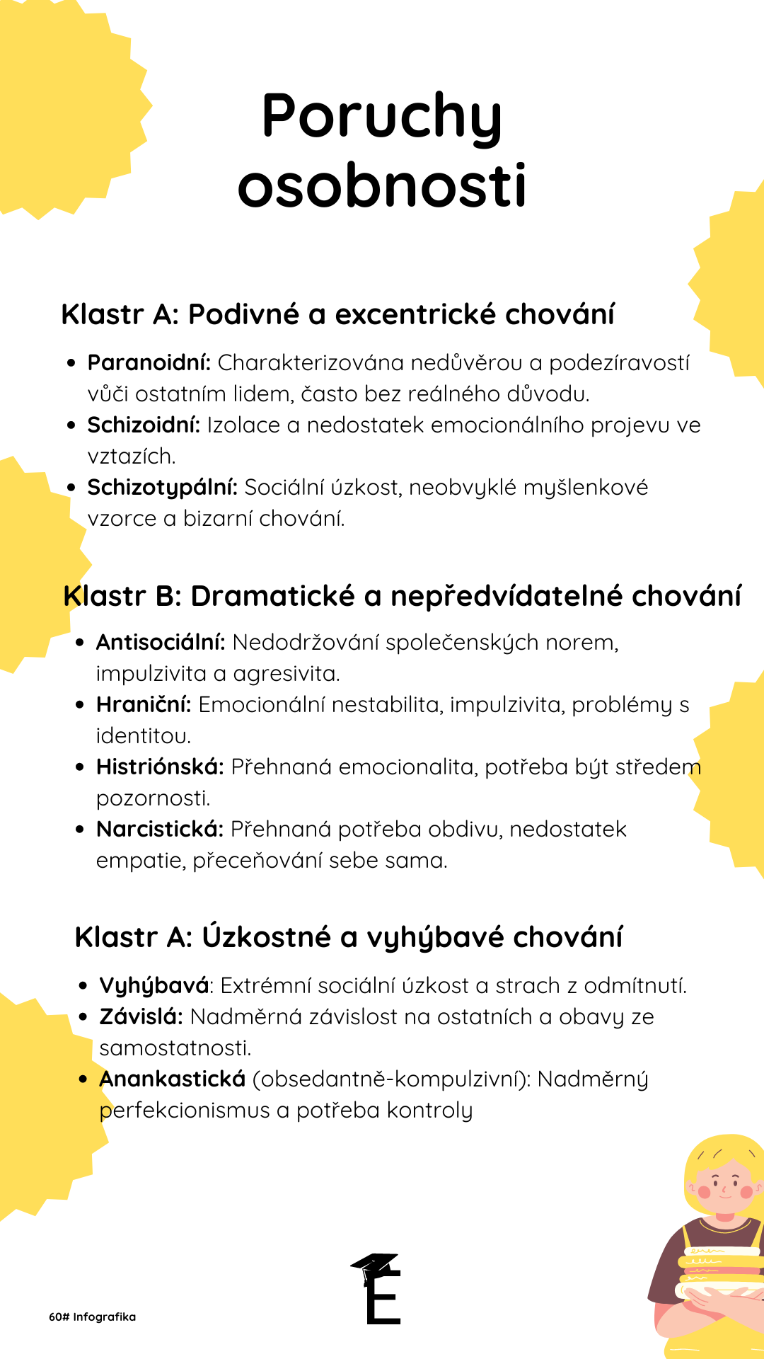 Poruchy osobnosti představují hluboce zakořeněné, nepružné způsoby myšlení a chování, které vedou k napjatým vztahům a často způsobují utrpení postiženým jedincům. Odborníci na duševní zdraví identifikují 10 různých poruch seskupených do tří klastrů, ačkoli mezi těmito kategoriemi existuje značný překryv.